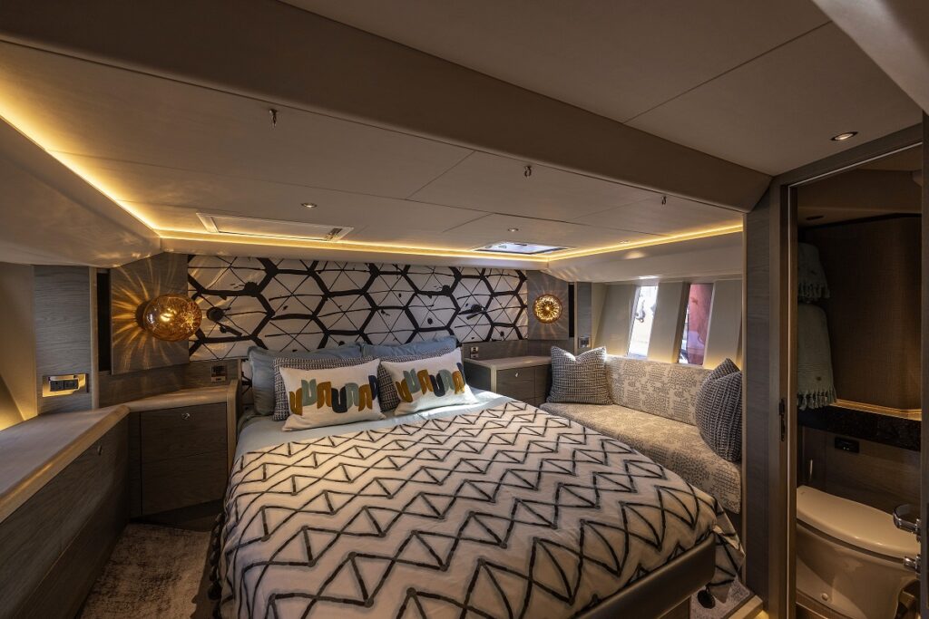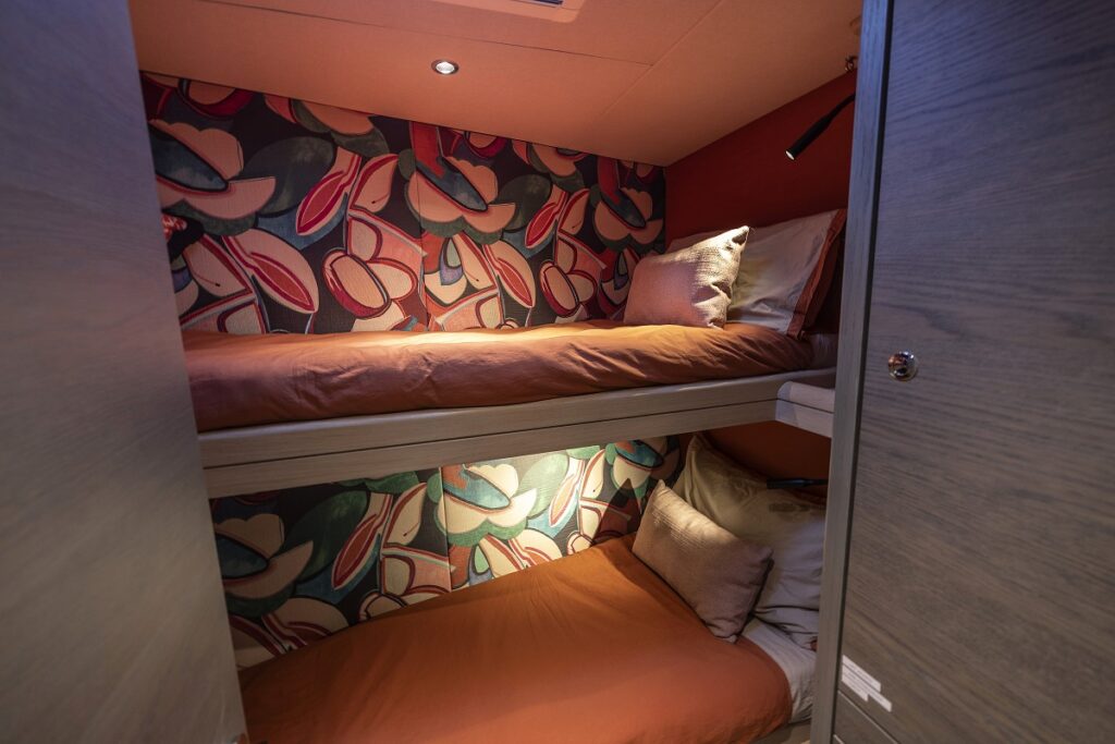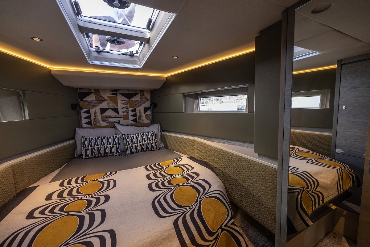 A proa del mástil, el espacio reservado para las visitas incluye una cabina con dos literas individuales superpuestas y un camarote doble que ocupa gran parte de la proa. Aquí también destaca la luz de las ventanas de casco y de las dos escotillas que, además, ofrece salida directa a cubierta.