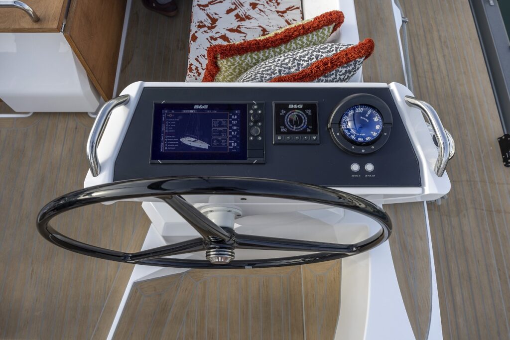Uno de los aspectos clave de la navegación de este barco es la practicidad de maniobra y la capacidad de poder llevarlo con pocas manos. Los principales reglajes se concentran muy próximos a ambas ruedas de timón por lo que, prácticamente, no es necesario salir de la protección de la bañera para realizar modificaciones en el trimado. Los winches de escota de mayor y génova se encuentran muy próximos al asiento del timón, la reacción a cualquier cambio puede ser inmediata.
