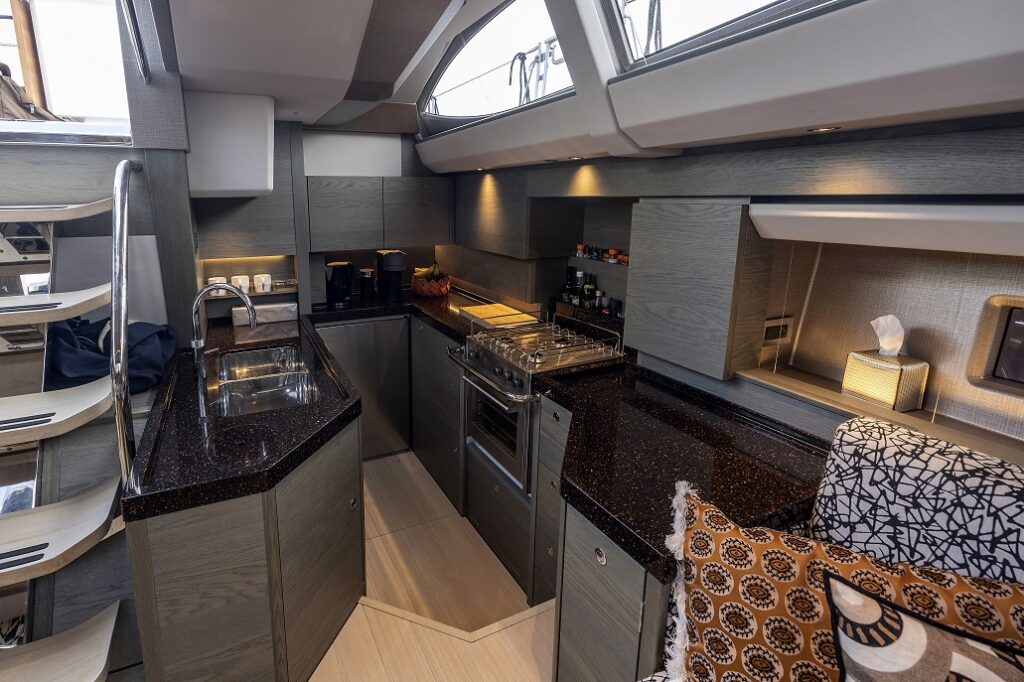 En el lado de babor hacia popa y un escalón más abajo se desarrolla la cocina con un formato de U alargada, por lo que el espacio de encimera es abundante, el pasillo es contenido y evita “atarse” a la cocina si hubiera mucha escora amurados a babor. Bajo la encimera hay espacio para todo, hasta para un lavavajillas.