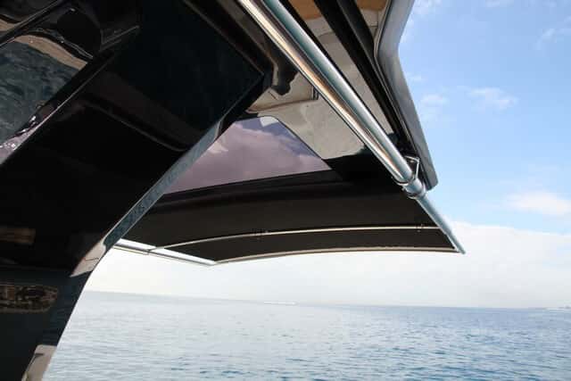 No falta, a estribor un asidero de inoxidable y un reposapiés del mismo metal. Pero sí estaría bien que el acompañante de babor dispusiera frente así de un asidero. Nos gusta especialmente el T-top, hecho en fibra de carbono y con el techo acristalado. Po la parte posterior se extiende eléctricamente una toldina para proteger del sol la zona de popa.