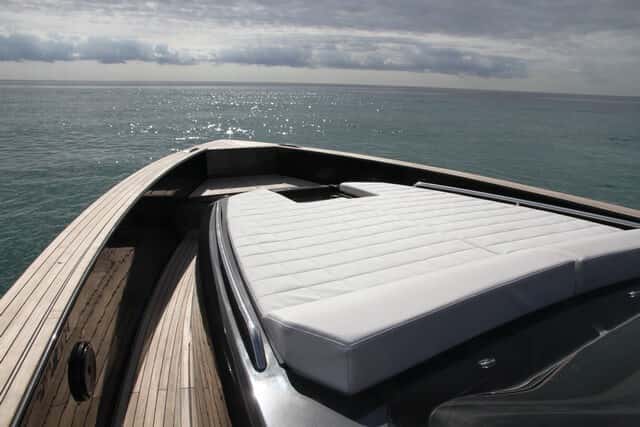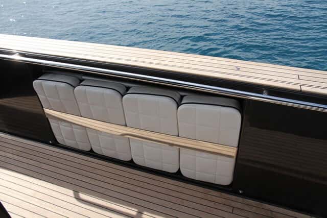 Es un barco que en los detalles y los acabados descubre la calidad de la marca, como las cornamusas serigrafiadas a láser con la marca, la teca en la cubierta, el diseño del mobiliario, o piezas de calidad como los pasamanos de inoxidable o las exclusivas defensas de Pardo, entre otras cosas. No obstante, también cabe aclarar que algunos detalles están por modificar, propios de un prototipo como es esta segunda unidad, pero que son de fácil modificación prevista.