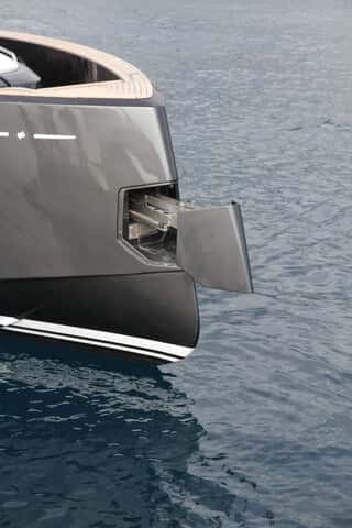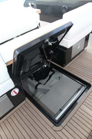 La zona de popa se ve despejada, con un módulo de solárium que esconde el garaje, habilitado para un anexo de 2,20 metros, o como gran espacio de estiba. Los pasos directos a la plataforma de baño no tienen desnivel y carecen de quitamiedos. La plataforma en la unidad probada era la opcional, hidráulica (18.900 euros), formidable para el baño y el anexo. La de serie es corta, de 0,70 m y la fija larga, opcional, de 1,40 m. Sin embargo, lo que resulta chocante es que toda la pieza del solárium, que es también el garaje, con apertura eléctrica, sea opcional —de 3.900 euros—, por lo que en el barco de serie toda la popa quedaría absolutamente sin nada, con la cubierta limpia y despejada, complementada por la plataforma de baño.