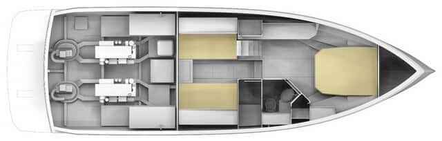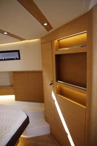 La Pardo 43 es bella por fuera y por dentro, y está bien hecha. Sin embargo, en los interiores —personalizables, claro— se ha optado por un espacio único, propio de un barco abierto de día, donde la cabina debe jugar un papel secundario, ya que la cocina está fuera y la mesa de la gran dinete también. Aquí, en el interior, nos encontramos con una cama de matrimonio delante y un espacio a popa con una segunda cabina, destinada a invitados, con dos literas en paralelo —que es opcional, con su separación mediante mamparo—, bajo el nivel de la bañera. Es bastante alta y se ha cuidado su decoración, con una mesita en el centro y luces de lectura.