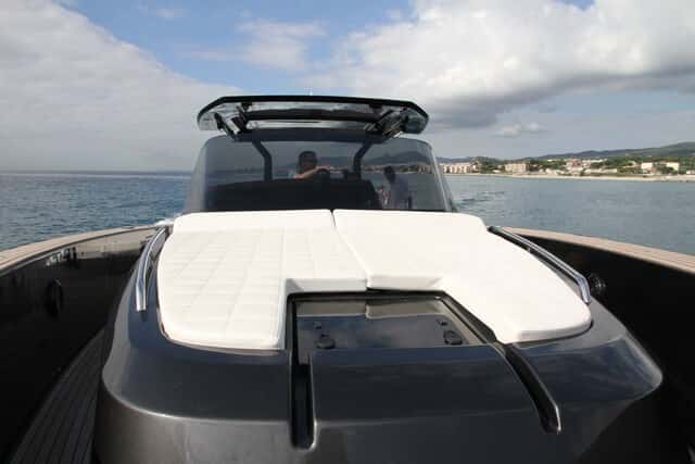 La proa queda ocupada por el solárium sobre el techo de la cabina y los pasos tipo walkaround que convergen en el pozo de fondeo.