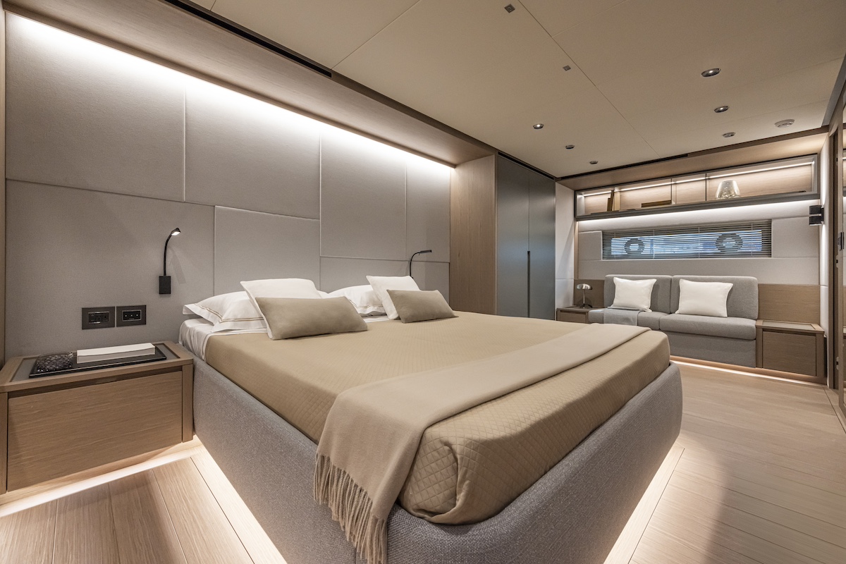 Concebido como una suntuosa casa rodeada por el mar, el interior del Pardo GT75 destaca por el silencio, la luz y la armonía de colores y materiales. Esta sensación se consigue a través de volúmenes excepcionalmente espaciosos y la excelencia artesanal del astillero.