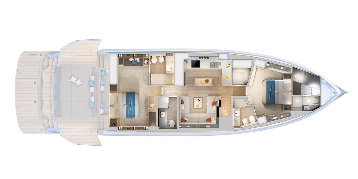 “A bordo del Pardo GT75 hemos traducido la experiencia de vivir junto al mar en un yate de lujo”, afirmó Massimo Gino, cofundador de Nauta Design. “Esta visión se ha integrado mediante la creación de múltiples espacios al aire libre, que incluyen un área de playa, tumbonas y áreas de comedor, lo que permite a los huéspedes disfrutar de cada área en diferentes momentos del día. Además, la disposición flexible ofrece hasta cuatro camarotes, lo que garantiza la comodidad y la privacidad”.