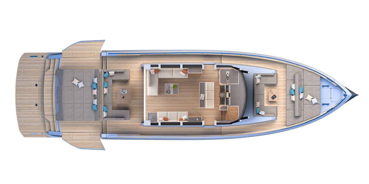 En el Pardo GT75, la disposición de la bañera está diseñada para albergar un solárium muy grande, detrás del sofá en forma de C: esta sección se levanta eléctricamente cuando es necesario, revelando un garaje dedicado a la embarcación auxiliar de hasta 3,7 m, una característica más de un superyate que de un barco de 75 pies, imprescindible en una unidad de estas características. En proa hay otro solárium amplio con respaldo abatible para mirar hacia el mar o hacia el sofá y la mesa de café frente al parabrisas. Además, las bordas altas y los pasavantes amplios proporcionan la máxima seguridad en la circulación por cubierta.