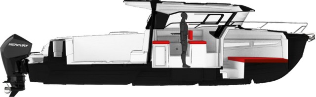 Opcionalmente puede montar una motorización doble con dos Mercury de 200 Hp, una solución que nos parece muy interesante porque el barco mantendrá una mejor estabilidad direccional y seguramente con algo más de potencia en salida y algún nudo más de punta, también con más peso a popa —que no le irá nada mal, porque casi le falta un poco— pero con un precio final más caro. Sería, desde luego, realizar la prueba con los dos de 200 Hp para comparar las prestaciones.