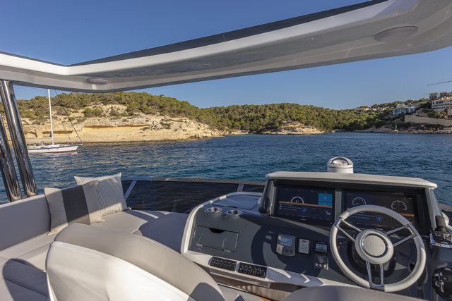 Tanto el del arriba como el del salón llaman la atención por su equipamiento. El del fly, más sencillo y con un diseño básico, presenta dos grandes pantallas, para los motores y la navegación, con los mandos electrónicos de los IPS y el control de la hélice de proa, así como los sistemas de trimado, opcionales en este barco. No nos convence aquí arriba la colocación de un gran compás en la parte superior de la consola, ni la efectividad del deflector parabrisas.