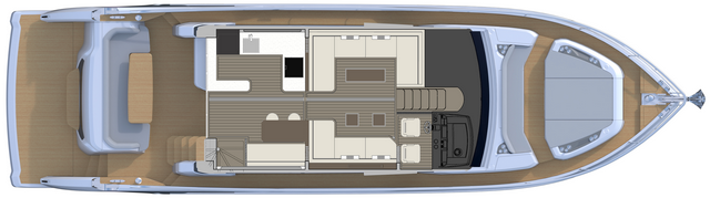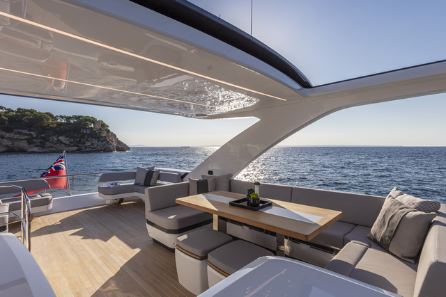 El fly es realmente espacioso y se prolonga hasta cubrir totalmente la bañera de popa. Reparte una zona de esta en la parte posterior, que se puede adaptar a la colocación de hamacas, y en el centro está presidido por un gran sofá en forma de U con una gran mesa. La parte delantera queda ocupada por otro asiento y un espacio destinado a solárium junto a la consola del puesto de gobierno. Un mueble de servicio que se puede equipar al gusto del armador, puede hacer las funciones de cocina o de bar. El hard top equipa un techo textil que se desplaza eléctricamente.