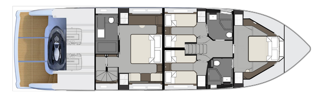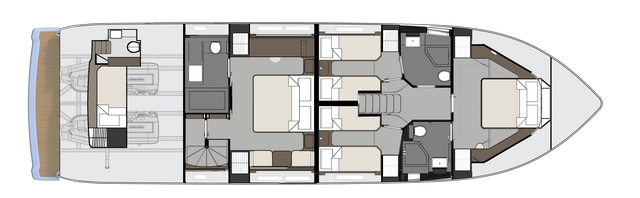 Una segunda escalera frontal, junto al puesto de gobierno conduce a la zona de noche, donde se reparten tres cabinas más. Dos gemelas, a babor y estribor, con dos camas cada una, que se pueden convertir en una de matrimonio si es necesario; y la cabina de proa. Aquí dos aseos con ducha, inodoro y lavabo completan la distribución interior. Uno de estos aseos comunica solamente con la cabina de proa, y el otro da a la cabina es babor y al espacio distribuidor.
