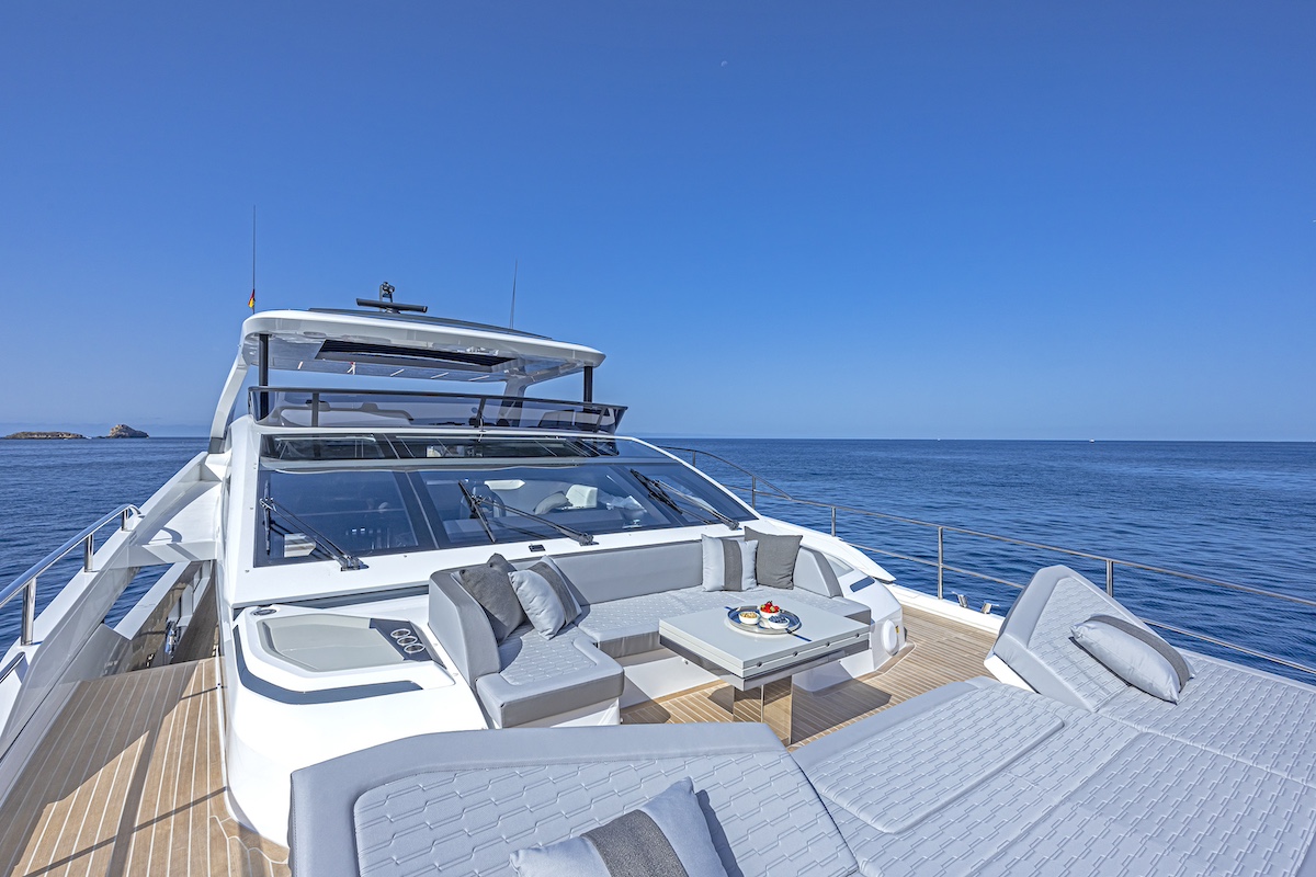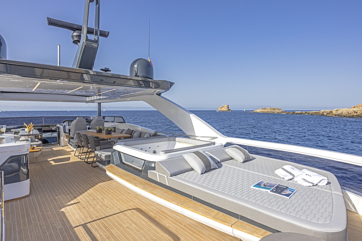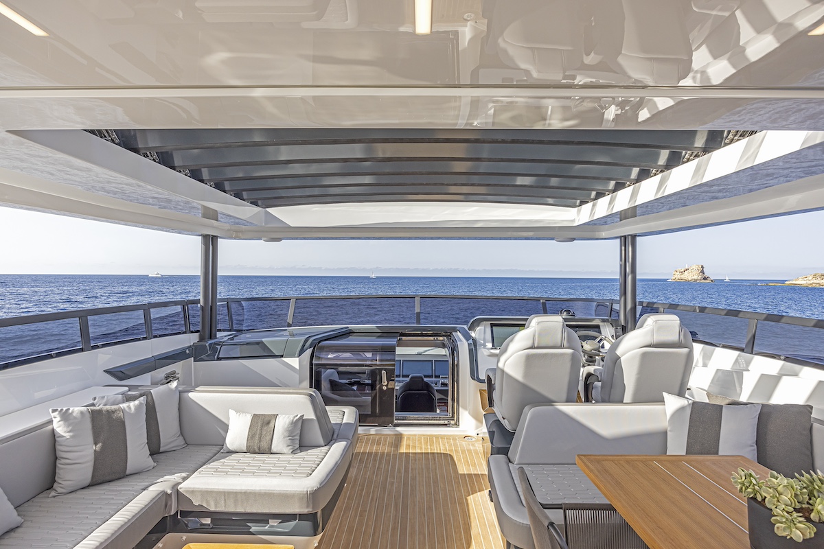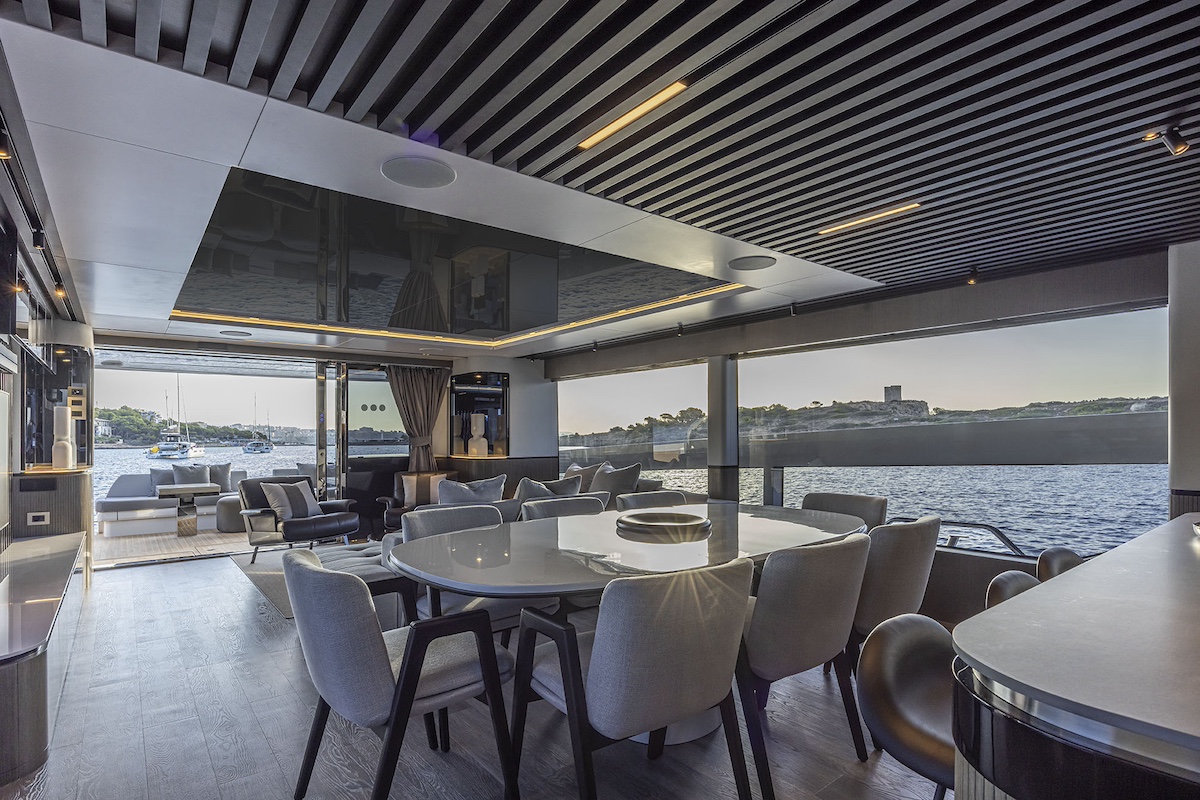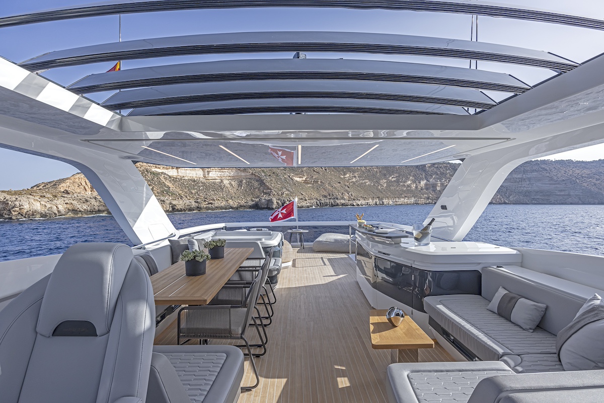 El Pearl 82 está excepcionalmente bien comunicado, ofreciendo a su propietario acceso directo a una terraza privada abierta a proa. Desde allí, el salón de proa está a sólo unos pasos, invitando a los huéspedes a tomar el sol y descansar alrededor de una mesa de cóctel. Además de la típica escalera que baja a la cubierta principal, la zona de proa también está conectada con el flybridge, que cuenta con una mesa de comedor de gran tamaño, un bar multifuncional enfrente y, a popa, un solárium y una bañera de hidromasaje. De este modo, los invitados pueden moverse directamente entre los diferentes espacios exteriores, lo que permite afirmar al astillero que “el Pearl 82 ofrece la primera cubierta semi walkaround de su clase”. Todas las zonas exteriores pueden protegerse con un toldo bimini en la cubierta de proa, persianas eléctricas y el techo rígido variable de lamas ajustables, que tiene tres posiciones: sombra total, semisombra y sol.