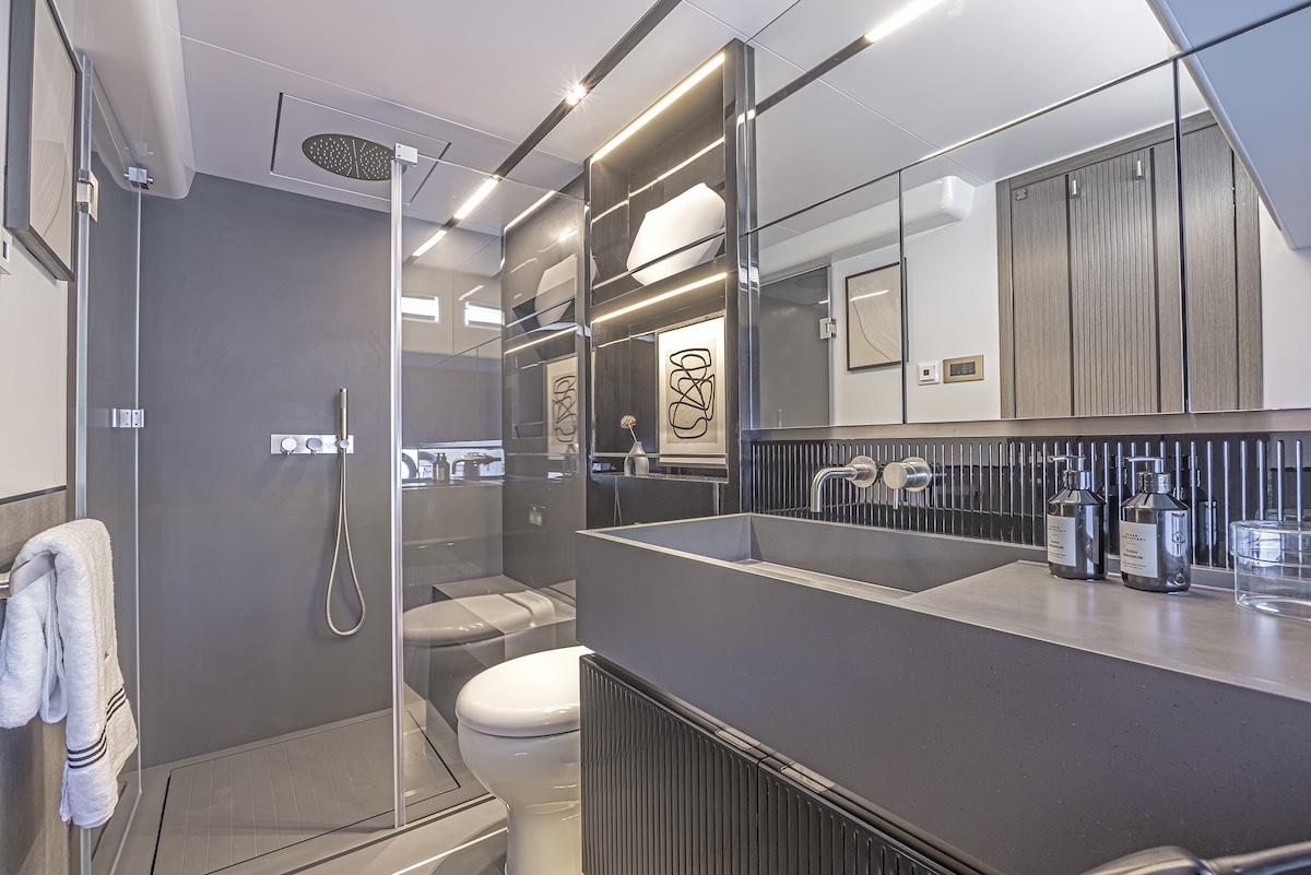 Bajo la cubierta hay otros cuatro camarotes de invitados con baño propio, dos dobles y dos individuales, todos tan bien decorados como la suite de la cubierta principal, y todos aislados de la sala de máquinas por los camarotes de la tripulación.