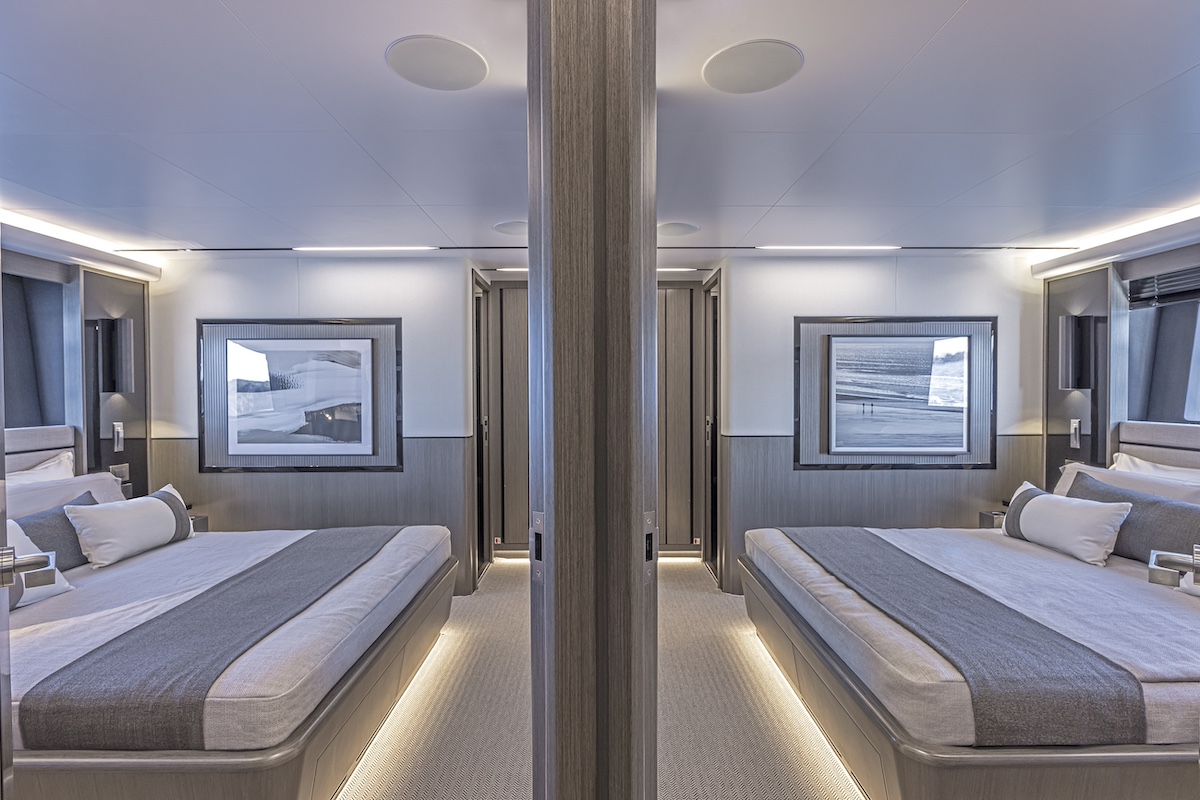 La suite del armador de la cubierta principal está precedida por una espectacular entrada con vistas panorámicas, una característica que fue tan bien acogida en el Pearl 95 que la marca decidió incorporarla al Pearl 82, esta vez con la ventaja añadida del acceso directo a una terraza en el pique de proa.
