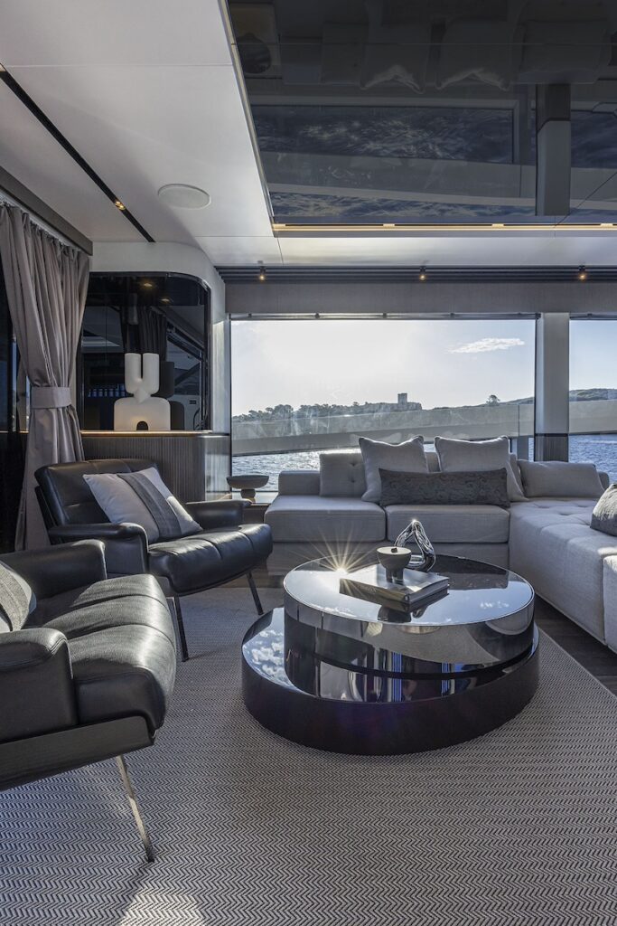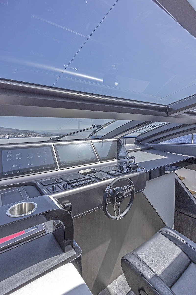 “El diseño tenía que mantener el equilibrio entre un perfil deportivo con grandes volúmenes interiores y un amplio acristalamiento del casco, la superestructura y el techo”, afirma el diseñador Bill Dixon. Observando la silueta en navegación de este 80 pies, no cabe duda que el nuevo modelo ha logrado este objetivo.