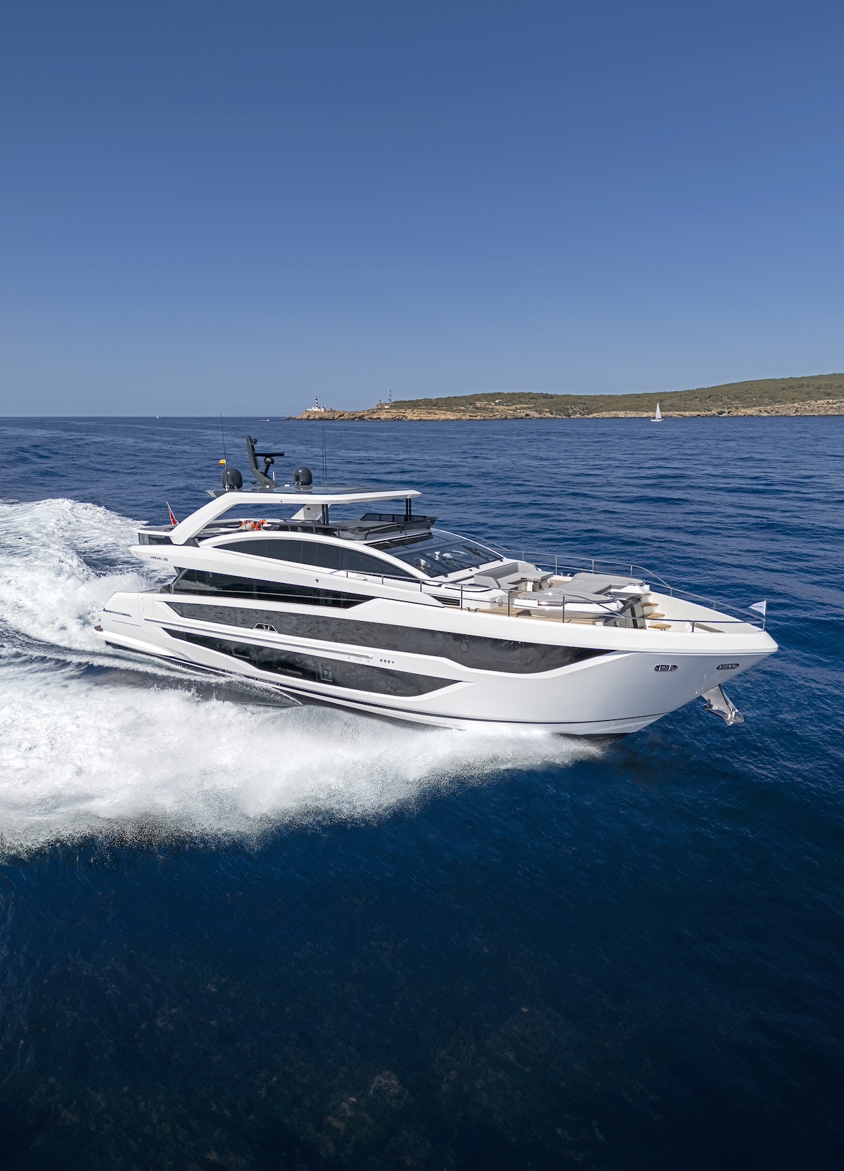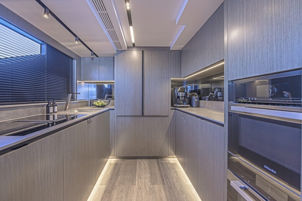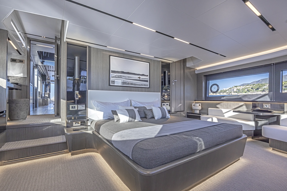 Empujando las fronteras del diseño en esta tipología de cruceros de lujo, el nuevo modelo ofrece muchas de las características de un superyate en sólo 25 metros, con la integración de una suite en la cubierta principal entre cinco camarotes, un puesto de gobierno elevado y pasillos directos que conectan todas las zonas exteriores de proa a popa, incluida una terraza privada en proa, a la que también se puede acceder desde la cubierta principal y desde el flybridge.