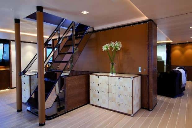 El salón principal mide nada menos que 108 metros cuadrados, y ha sido creado como un espacio abierto que no ofrece trabas al paso de la luz natural y no deja recovecos. Como es habitual en los veleros de Perini, queda dividido funcionalmente en dos áreas, la del comedor y la de estar, separadas por un elemento arquitectónico central que deja pasos a las bandas y que alberga en su cara de proa una aérea escalera de wengué y acero que conduce a cubierta superior. Las dos zonas pueden aislarse con sendas puertas deslizantes a ambas bandas de este elemento divisorio.