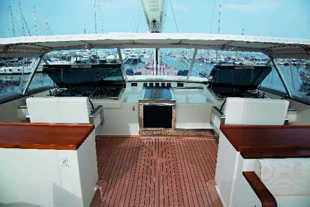 Las imponentes consolas de gobierno —una a cada banda destinadas a control electrónico e hidráulico de aparejo, velas y motores— presiden la proa de esta cubierta, reservada a capitán y tripulación, pero con grandes sofás que permiten a los invitados seguir la maniobra desde la platea, mientras disfrutan de un refrigerio que queda al alcance de la mano gracias a las dos grandes neveras integradas en sendos muebles exentos que quedan a su espalda y separan esta zona técnica del resto de la cubierta, más destinada al relax. Una entrada central da acceso al puente de mando, que ocupa prácticamente toda la anchura de la superestructura en esta zona.