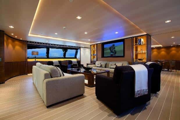 La zona de estar dispone de dos sofás enfrentados y separados por mesas bajas y cuatro sillones. Como es de esperar la gran pantalla de televisión queda escondida en el mamparo. La mesa del comedor extensible posee capacidad para 11 comensales, que es la del barco en cabinas, y se ha reservado a estribor una zona de juegos de mesa.