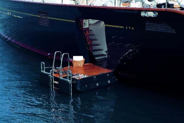 Como en el resto de unidades de la serie, destaca el portón lateral del casco a popa babor que facilita el izado y botadura de las embarcaciones auxiliares y juguetes de agua estibados en el lazareto de 42 metros cuadrados. También desde aquí se accede a la zona técnica de la sala de máquinas, con sus sistemas y dos grandes motores que le permiten alcanzar una velocidad máxima de 15 nudos y de 12,5 en crucero, con una autonomía a motor de 3.500 millas náuticas.