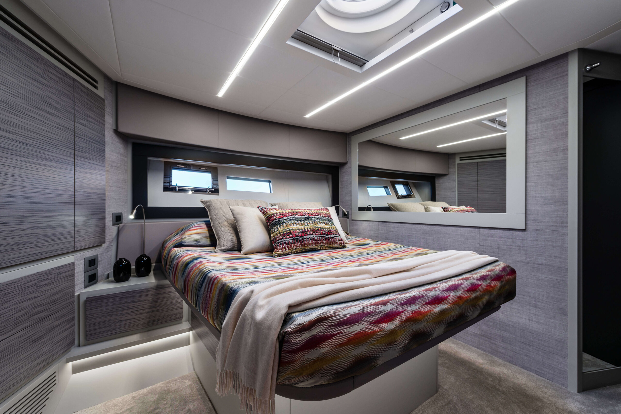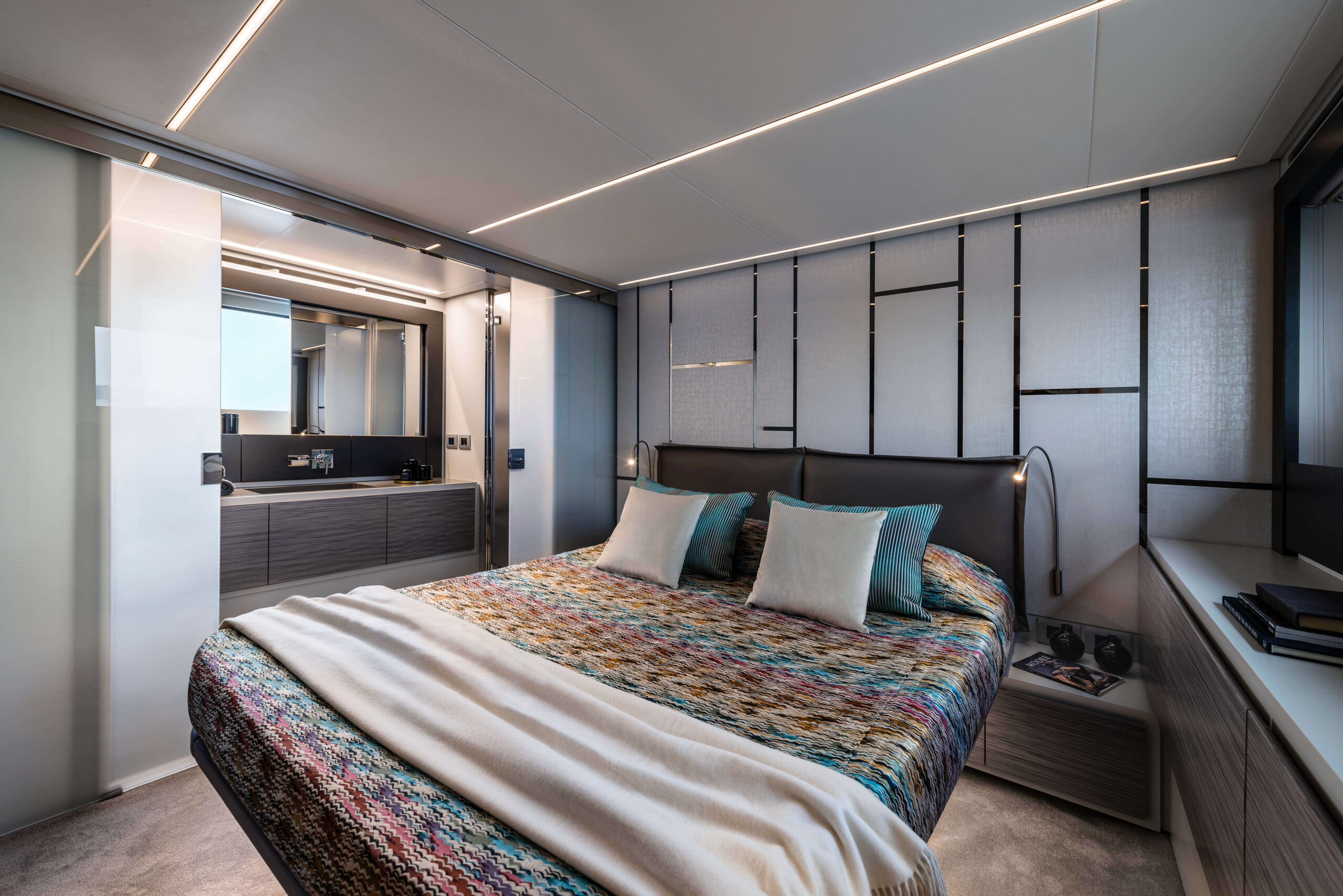 Unos escalones a popa conducen al área del propietario, una suite a toda la manga iluminada por luz natural a través de un ojo de buey rectangular orientado verticalmente que ofrece una vista panorámica espectacular sobre la superficie del agua. A lo largo del costado de estribor del casco se ha situado el baño, dividido en tres áreas que se extienden a todo lo ancho de la cabina, de las cuales está separado por dos puertas correderas de color blanco mate.