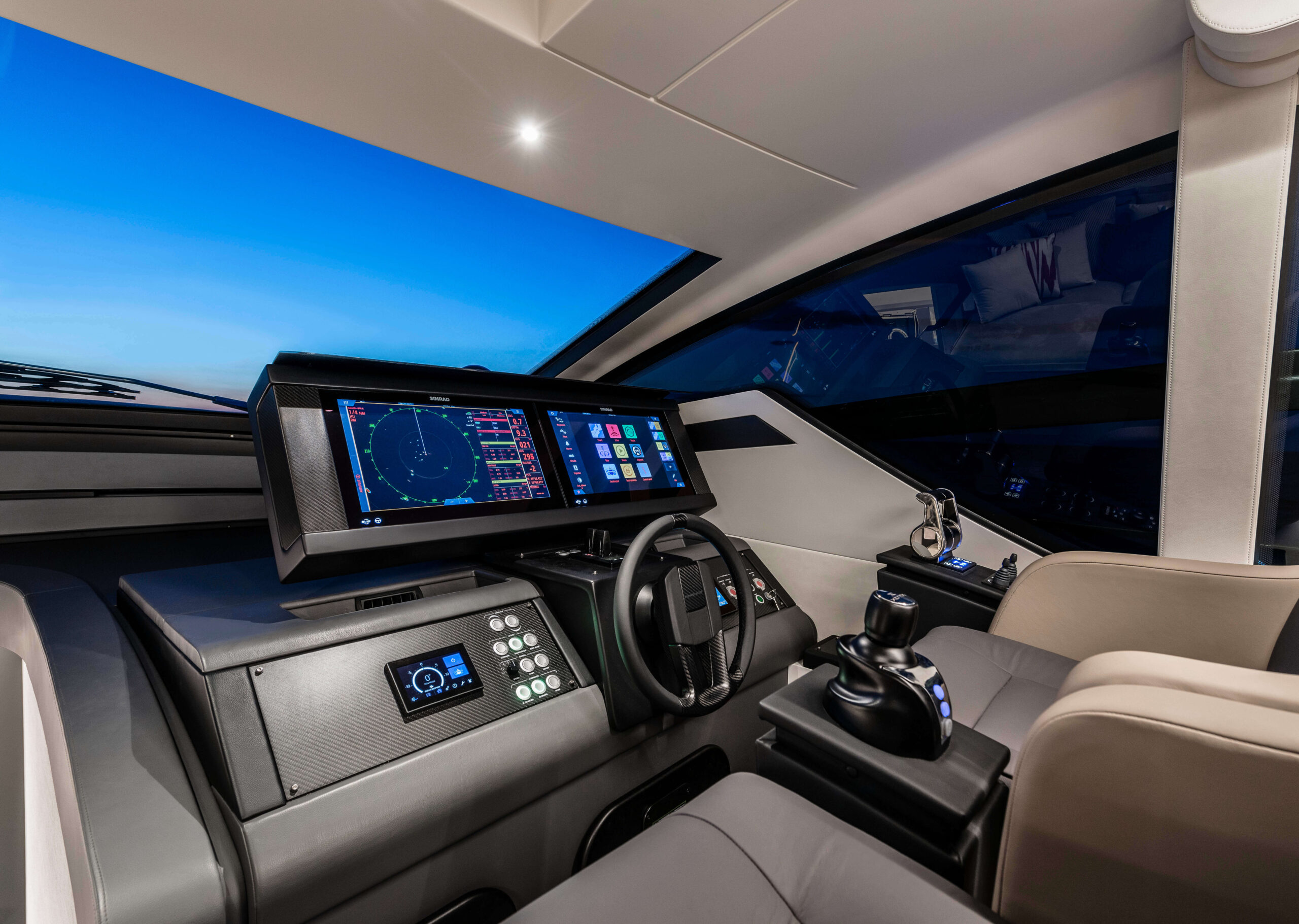 Se accede al salón principal desde la cubierta de popa a través de una puerta corrediza que forma parte de una gran superficie acristalada totalmente retráctil que brinda continuidad entre las áreas exterior e interior, creando un amplio espacio abierto único. Todo el volumen enmarcado por la superestructura está inundado de la luz natural que penetra a través de las amplias ventanas laterales y el gran techo corredizo que se puede abrir sobre el puesto de gobierno de estribor, que tiene dos asientos de piloto separadas tapizadas en cuero Potrona Frau.