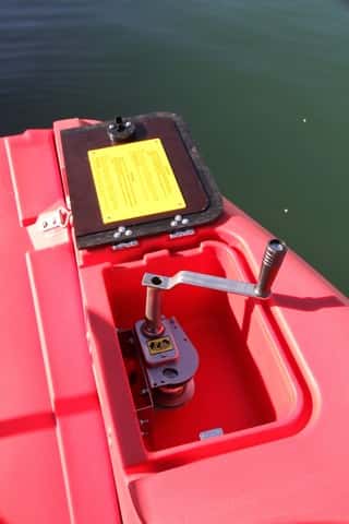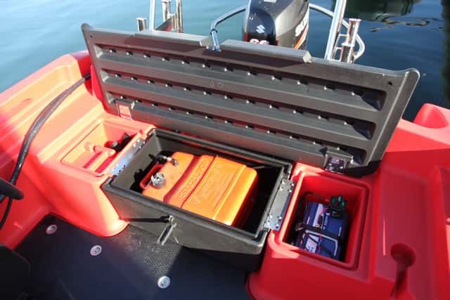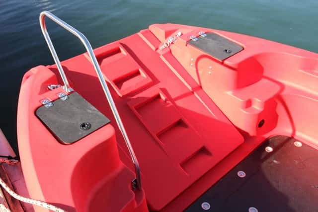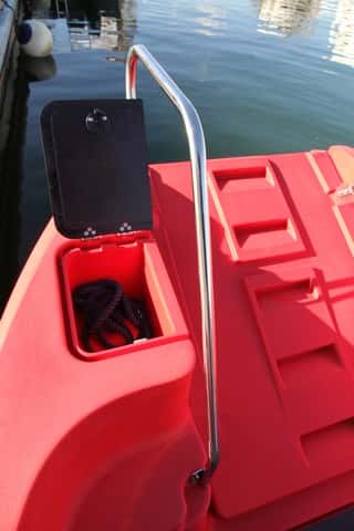Lo más característico de esta embarcación es el portón de proa, totalmente practicable, que se abre fácilmente mediante un sistema de manivela tipo winche con un cable. Esta apertura deja libre toda la proa, lo que facilita las tareas de carga y descarga, rescate, embarque, etc. La gran bañera deja un amplio espacio libre, de modo que se puede estibar prácticamente lo que se desee (hasta 1.220 kilos), como una camilla, por ejemplo. El portón cuenta con una rampa con una anchura de 92 cm que además se puede fijar en la posición que más convenga, lo que no obliga a dejarla totalmente abierta y hace más fácil el embarque o desembarque de ciertos elementos, tales como sillas de ruedas, objetos grandes, etc. La desmultiplicación del cabrestante con el cable tiene la siguiente fuerza para subir sin esfuerzo la rampa.