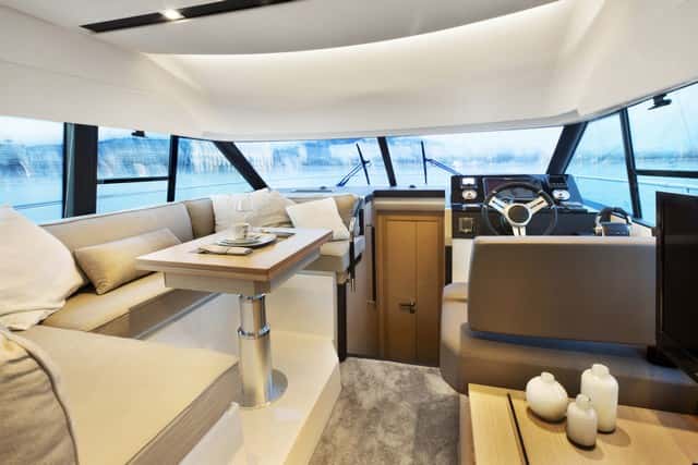 Respetando la filosofía dela marca esta Prestige presenta un salón con la cocina a ambos lados de la entrada (nevera a babor y cocina a estribor), en comunicación con la bañera depopa, un sofá en U a estribor y una dinete elevada (convertible en cama doble), al lado del puesto de gobierno. No obstante, el mueble de la cocina, con el fregadero y la vitrocerámica al descubierto podría contar con una tapa disimular el protagonismo del grifo y mejorar de este modo la imagen del salón.