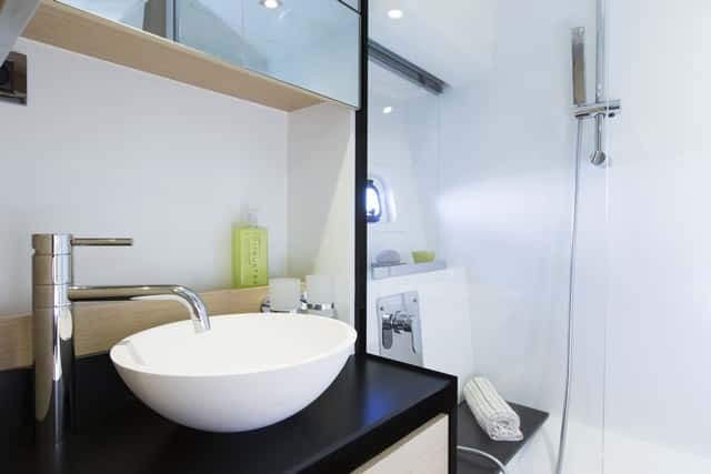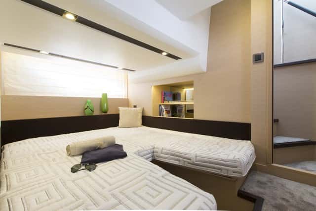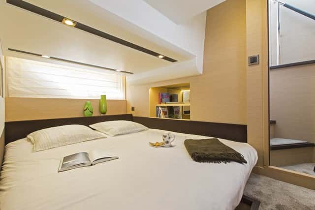 La cabina del armador, a media eslora, se puede abrir. Cuenta con su propio aseo completo y ducha separada. (c) Jean-Marie Liot