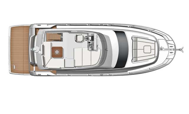 Dos accesos directos a la bañera desde la popa, cofres para las amarras, y buenos herrajes tanto para el fondeo como para puerto. Los pasos laterales cumplen con un mínimo de anchura, suficientes, y no echamos en falta los pasamanos altos a los largo del fly, aunque como en otras Prestige no llegan muy a proa y se quedan cortos.