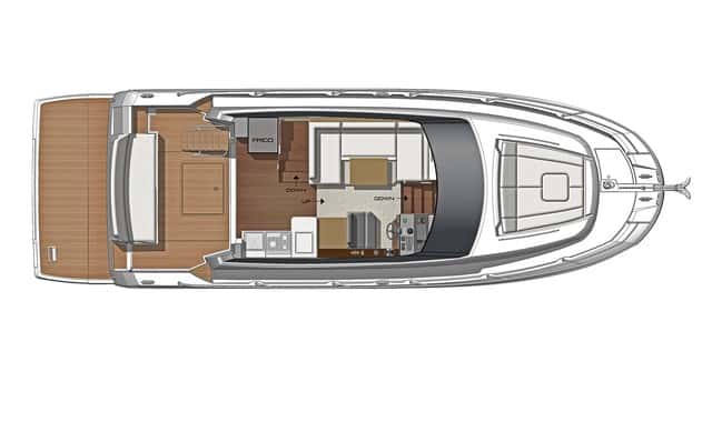 El concepto de funcionalidad se impone en todo el barco. La 450 en su versión flybridge resulta atractiva, tanto por la buena distribución exterior como interior. La plataforma de popa es muy ancha, capaz de transportar un anexo, y en el caso de instalar los motores de 370 Hp admite una sumergible mediante el sistema hidráulico —en el caso de los IPS 400 de 300 Hp, el astillero no la admite—.