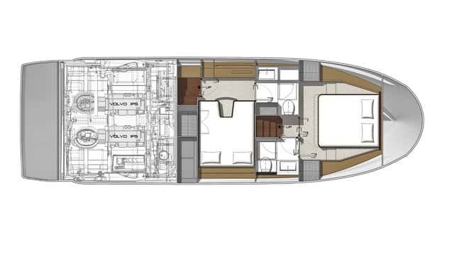 Las fuerzas ocultas de la gama Prestige son sus diseñadores y arquitectos. Si en el diseño exterior e interiorismo de Camillo Garroni determina la imagen exterior y la decoración, en la obra viva el responsable es otro nombre no menos importante en la construcción naval de embarcaciones de recreo, como es Michael Peters. Esto implica que la buena navegación está garantizada. Una V de 16 grados en proa y una salida de aguas adecuada a los IPS facilitan una navegación confortable y con cierto carácter deportivo. Además, en este barco Jeanneau ha adelantado un poco hacia proa los motores Volvo Penta D6, cuyo peso es de 886 kilos cada uno, con la transmisión correspondiente hacia popa para los pods IPS, con el fin de que el barco tenga un mejor asentamiento en el agua. Y así es, ya que navegando no tuvimos que recurrir en absoluto a los flaps ya que el barco bajaba la proa cuando iniciaba el planeo.