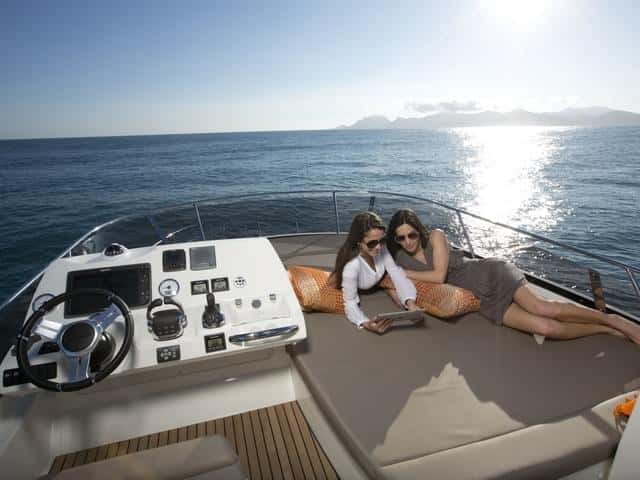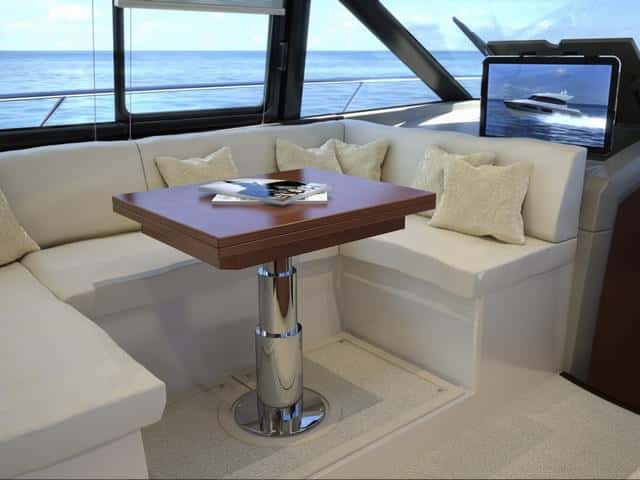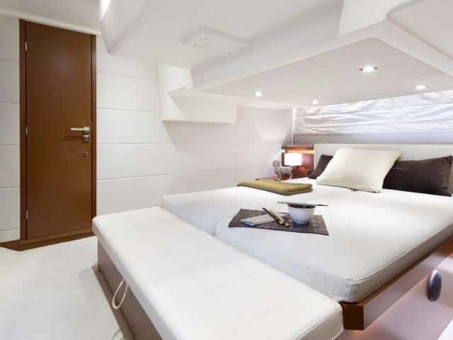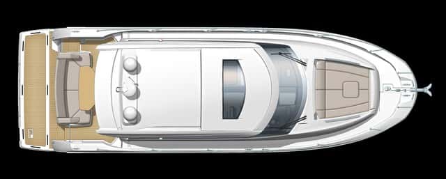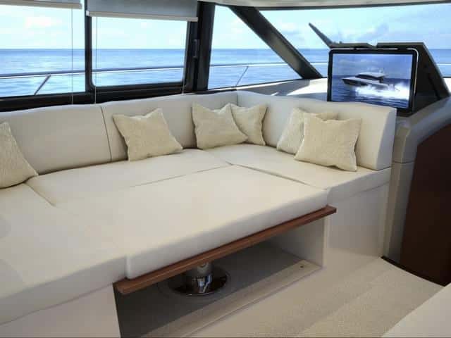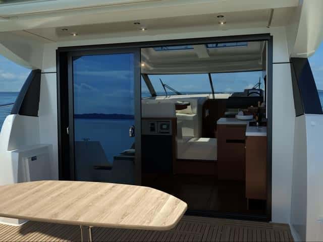 Por otra parte, la cubierta es la misma tanto en la 450 como en 450s, igual que los interiores. La bañera de popa, presidida por un gran sofá, y la enorme plataforma de baño son puntos fuertes en estas esloras. Opcionalmente se puede completar con una gran mesa de altura regulable para formar una gran dinete al aire libre o una tercera zona de solárium, si tenemos en cuenta el de la cubierta de proa y el del fly.