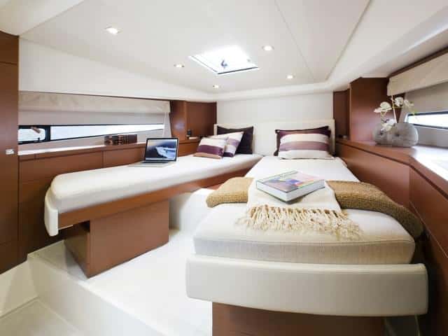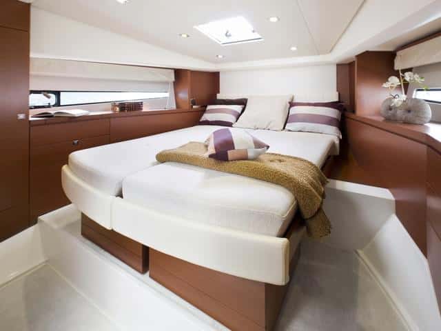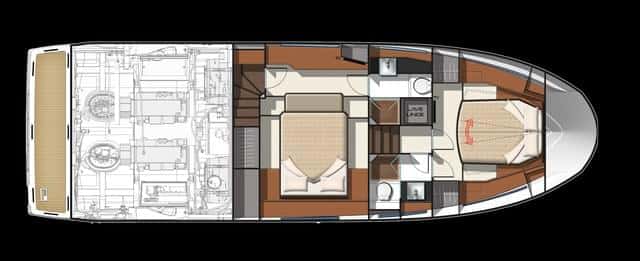 Las plantas son calcadas. La apuesta por dos cabinas separadas en un barco de esta eslora no deja de aportar cierta originalidad. Otras Prestige respetan esta premisa, pero en esta eslora de casi trece metros es un acierto, aunque seguramente una distribución con tres cabinas dobles pueda ser más comercial. Han optado por dos camarotes de armador, impresionantes por sus dimensiones en una eslora como ésta. En todo caso es un lujo que Prestige se puede permitir, vista la relación precio calidad y equipamiento de serie del barco. Y para tres cabinas el astillero argumenta que puede ofrecer la 500.