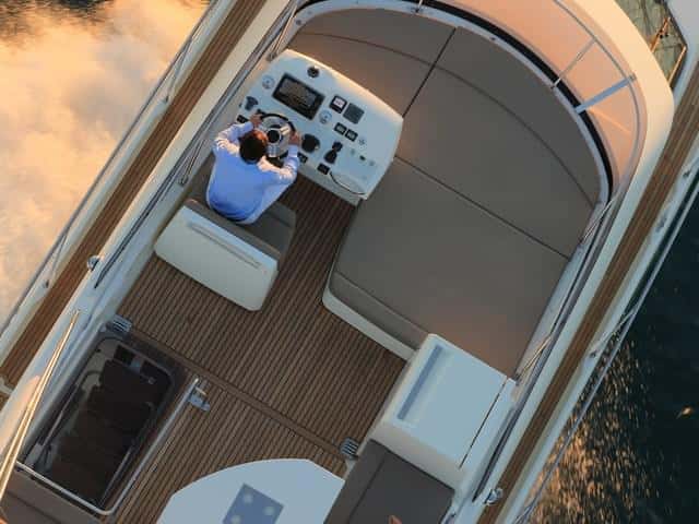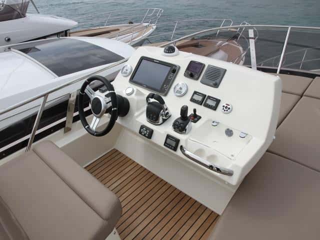 En el fly la consola, bastante más alta que la del interior, repite prácticamente el equipamiento del puesto interior. La consola no está adosada al parabrisas, sino que queda un poco retrasada con el fin de dejar espacio al solárium, pero tiene buena visibilidad y queda protegido. El asiento es monoplaza, fijo y dispone de reposapiés.