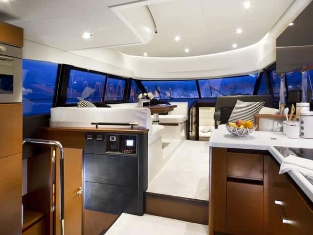 El salón está en sus límites. Comunicado abiertamente con la popa con una corredera de tres hojas, muestra la cocina junto a la entrada, a estribor, para poder trabajar tanto para el interior como para la dinete de la bañera. Es grande, con fogones a gas, nevera familiar (en el lado opuesto) y una buena superficie de trabajo que integra cajones y armarios.