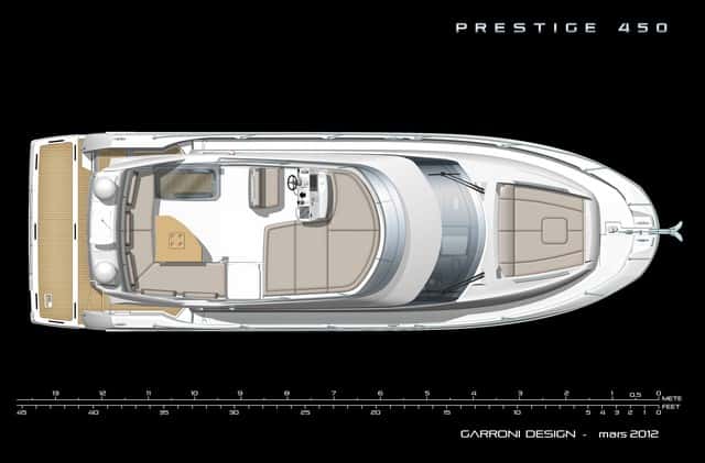 La Prestige 450 es la versión equipada con flybridge, un amplio espacio llevado casi al límite, que en su parte posterior cubre la bañera de popa. Toda esta zona superior queda protegida por un alto francobordo con pasamanos que contornea el fly, hasta el parabrisas deflector frontal. La zona de popa está ocupada por una amplia dinete con un gran sofá y una mesa, que se complementan con el mueble bar donde no falta la nevera, el lavamanos un grill y armarios. El solárium ocupa la parte delantera, junto al puesto de gobierno, a estribor.