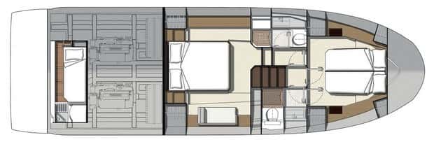Impecables en la decoración, elegantes y con gran capacidad de estiba por los armarios y cofres bien repartidos. El camarote del armador, a media eslora, abarca toda la manga; y el de proa comparte el aseo con el espacio distribuidor. Ambos cuentan con ducha independiente. Opcionalmente se puede añadir una tercera cabina de marinería a popa, con una litera y un pequeño aseo. Sin embargo, Prestige en este Prestige 460 solamente ofrece una sola opción de distribución, aunque hay espacio para plantear tres cabinas.
