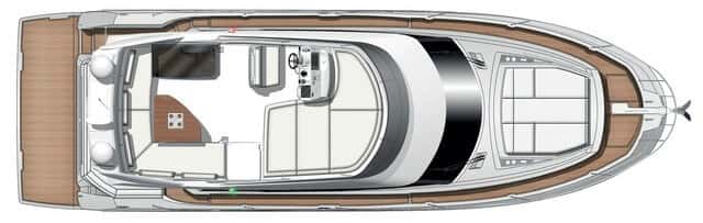 Barco para largas travesías, con muchos metros cuadrados al aire libre, ideal para el Mediterráneo (y también para zonas como la de Florida en EE.UU. donde esta gama tiene un notable éxito comercial).