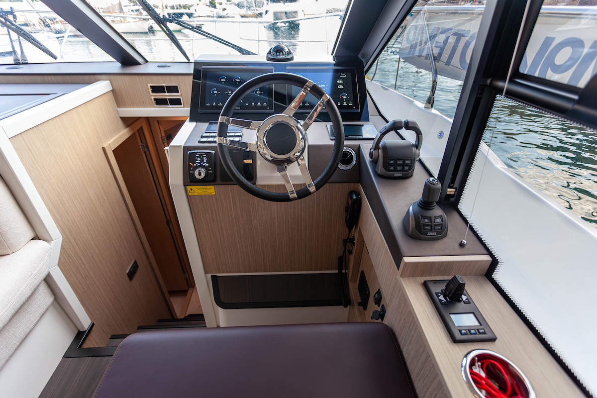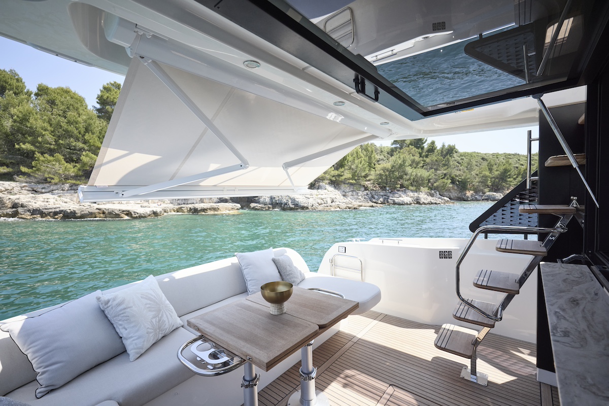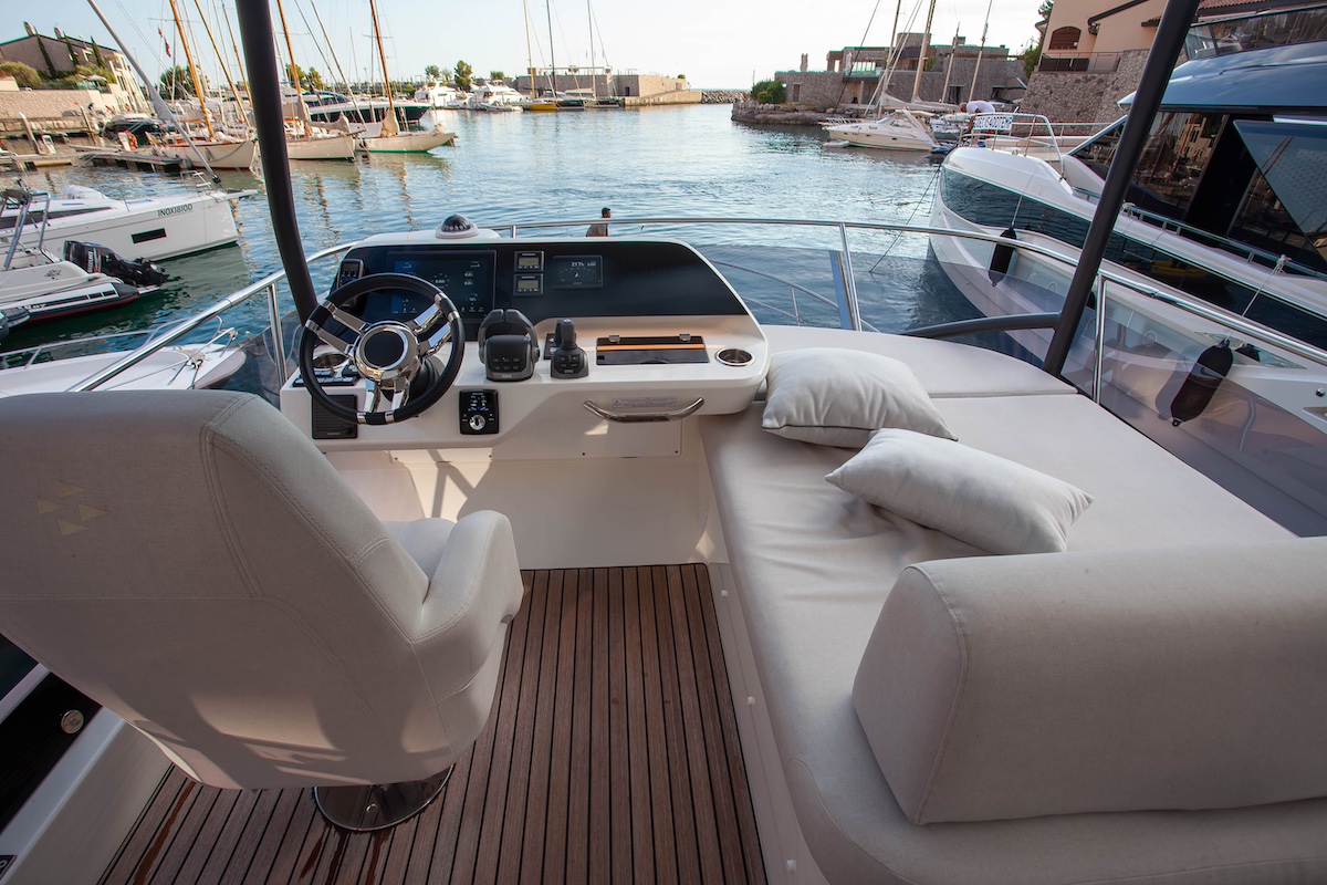 Además de poder disponer de mobiliario modular, junto al puesto de gobierno superior se ha creado un inmenso solárium para acompañar al piloto, quien dispone de una confortable poltrona individual enfrentada a un módulo de consola que agrupa todo el equipamiento necesario para la navegación. Y por supuesto, toda la cubierta del fly puede cubrirse son un techo rígido opcional para lograr protección frente a los elementos.