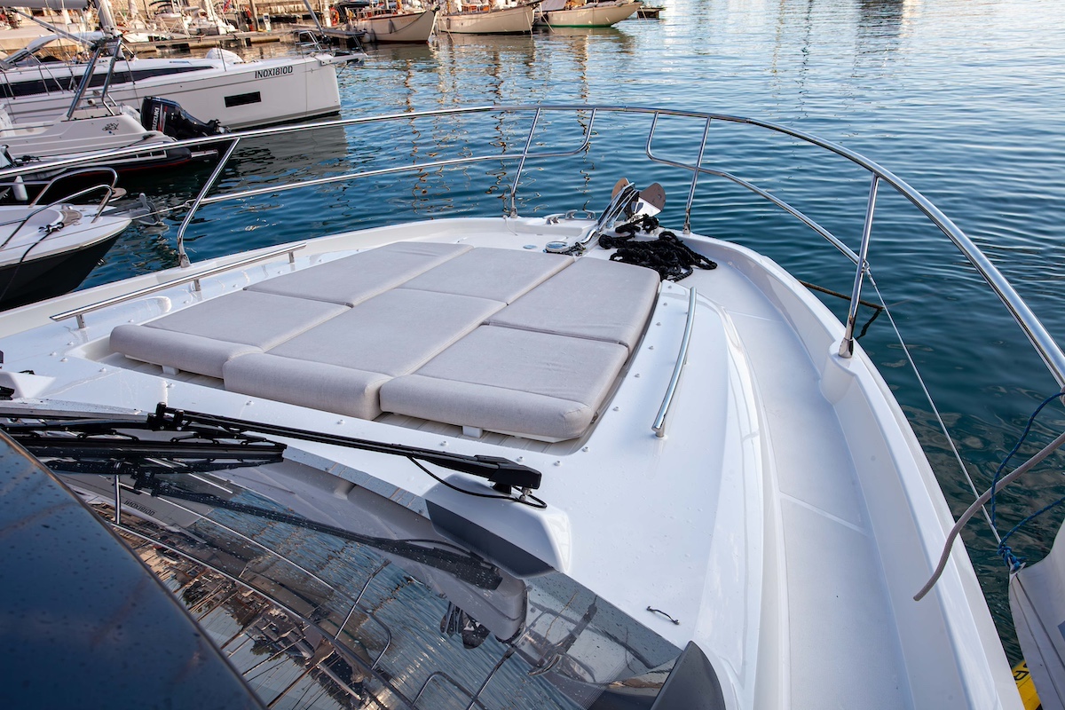 En cuanto a comportamiento, como pudimos constatar en los otros modelos de la línea F que hemos podido probar, el casco pasa suavemente la ola, sin pantocazos extemporáneos, la cubierta incluso en proa es seca a velocidades altas gracias a que la roda deflecta bien los rociones, y la protección del parabrisas envolvente del flybridge es excelente.
