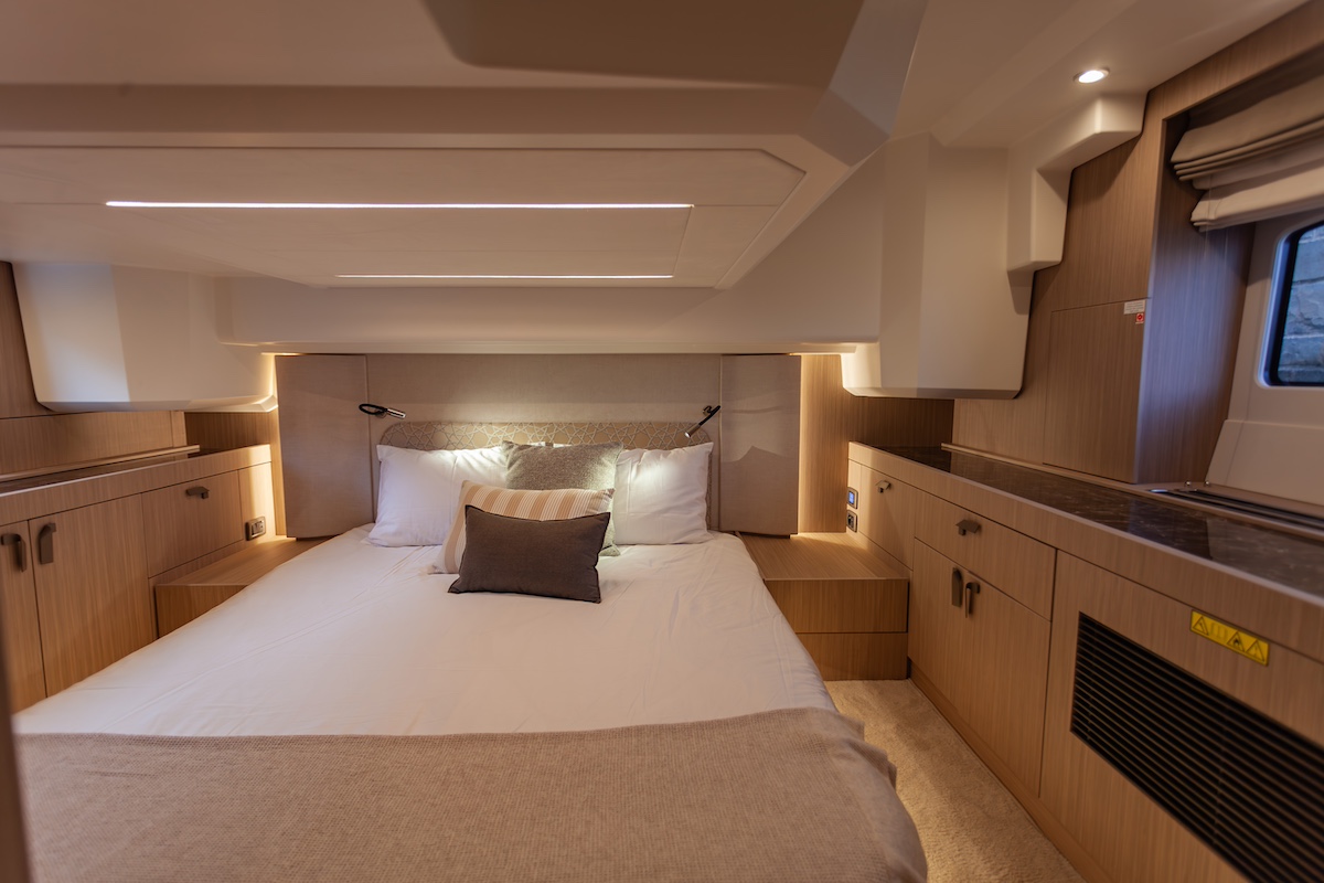 No sorprende pues, una vez a bordo, constatar que la atención al detalle es innegable. Desde la cabina hasta los camarotes, la calidad de los acabados, la selección de materiales y la delicadeza del diseño crean una atmósfera suave y relajante. Desde los tiradores de puerta curvados, el tacto de los textiles, la iluminación LED que perfila las entregas en el techo… cada detalle contribuye a la sensación de refinamiento que caracteriza a la línea F de Prestige.