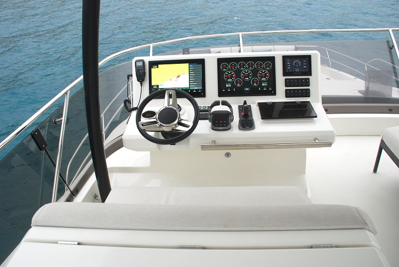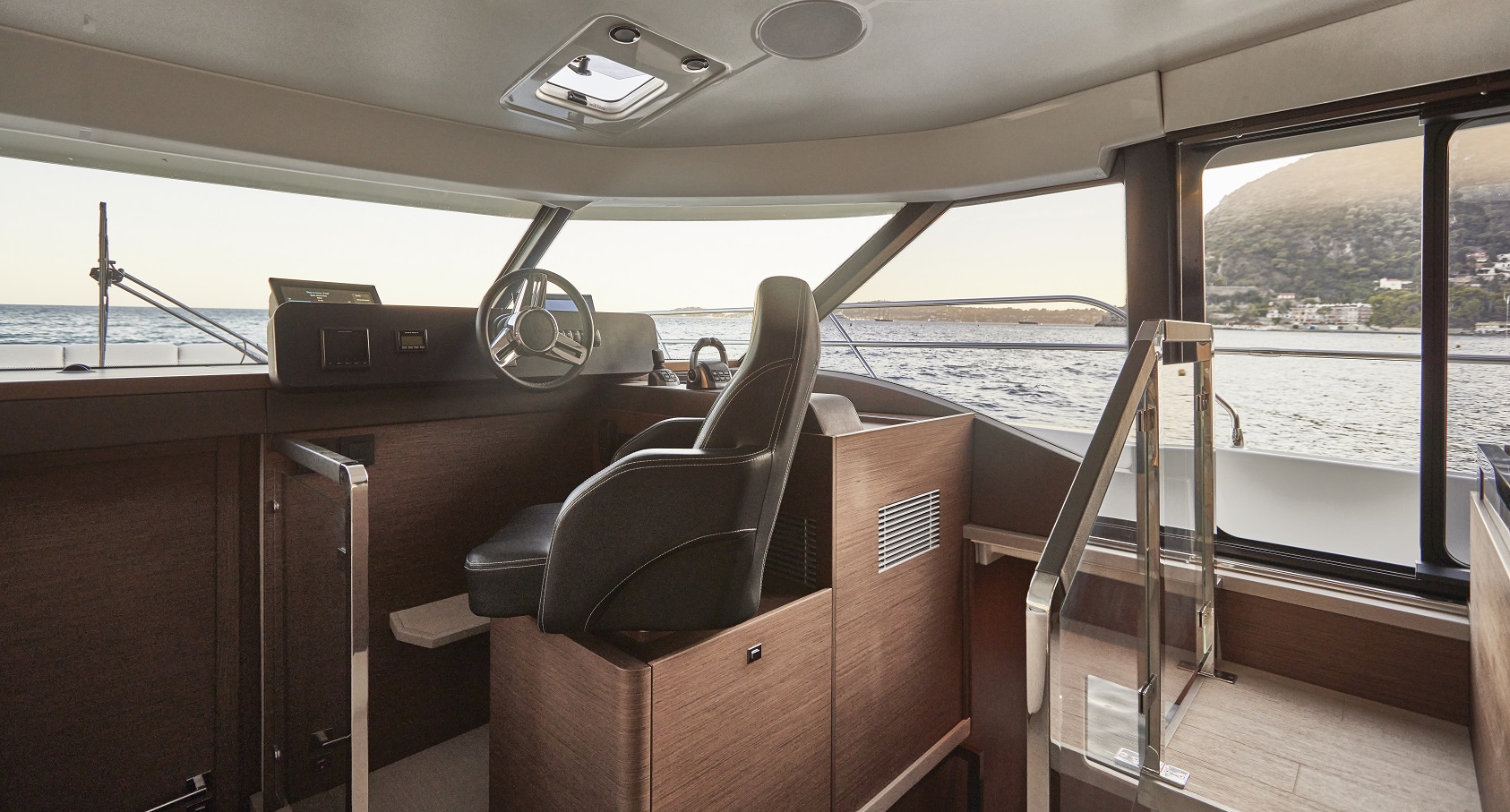 El puesto de gobierno, con un solo asiento giratorio y regulable para conducir de pie, equipa a ambos lados del volante dos pantallas multifunción de navegación y control y sitúa las palancas de los motores y el joystick en una consola ligeramente elevada que permite un apoyo perfecto. A su lado, el piloto dispone de una bandeja portaobjetos