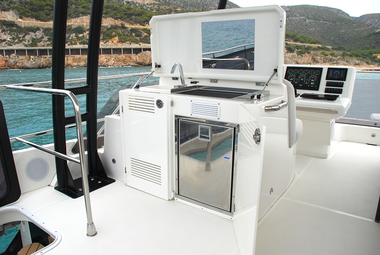 Tras el, el mueble bar incluye una gran nevera, fregadero de un seno y parilla, además de armario de estiba. Más que suficiente para servir a la zona de popa, destinada a estar, que ofrece una gran mesa rectangular en torno a un sofá en U cuyo brazo de popa se subdivide en dos, uno mirando hacia adelante y el otro hacia atrás, y que puede usarse también como si se tratase de una gran chaisse-longue doble quitando los respaldos.