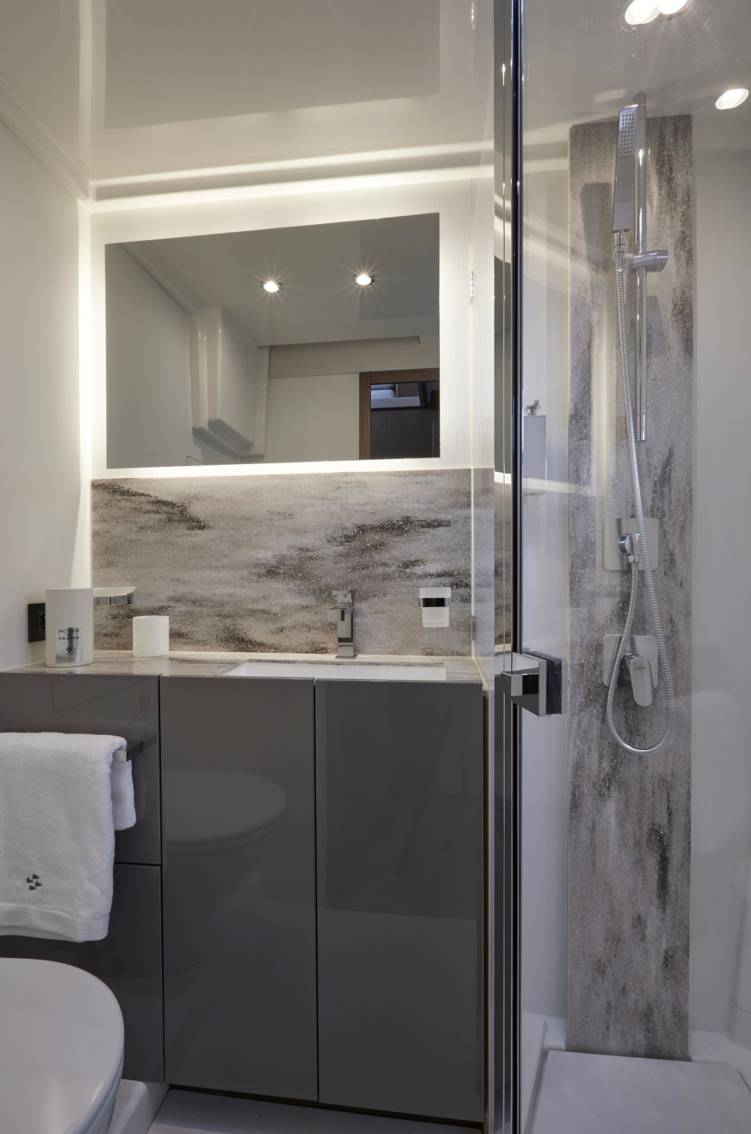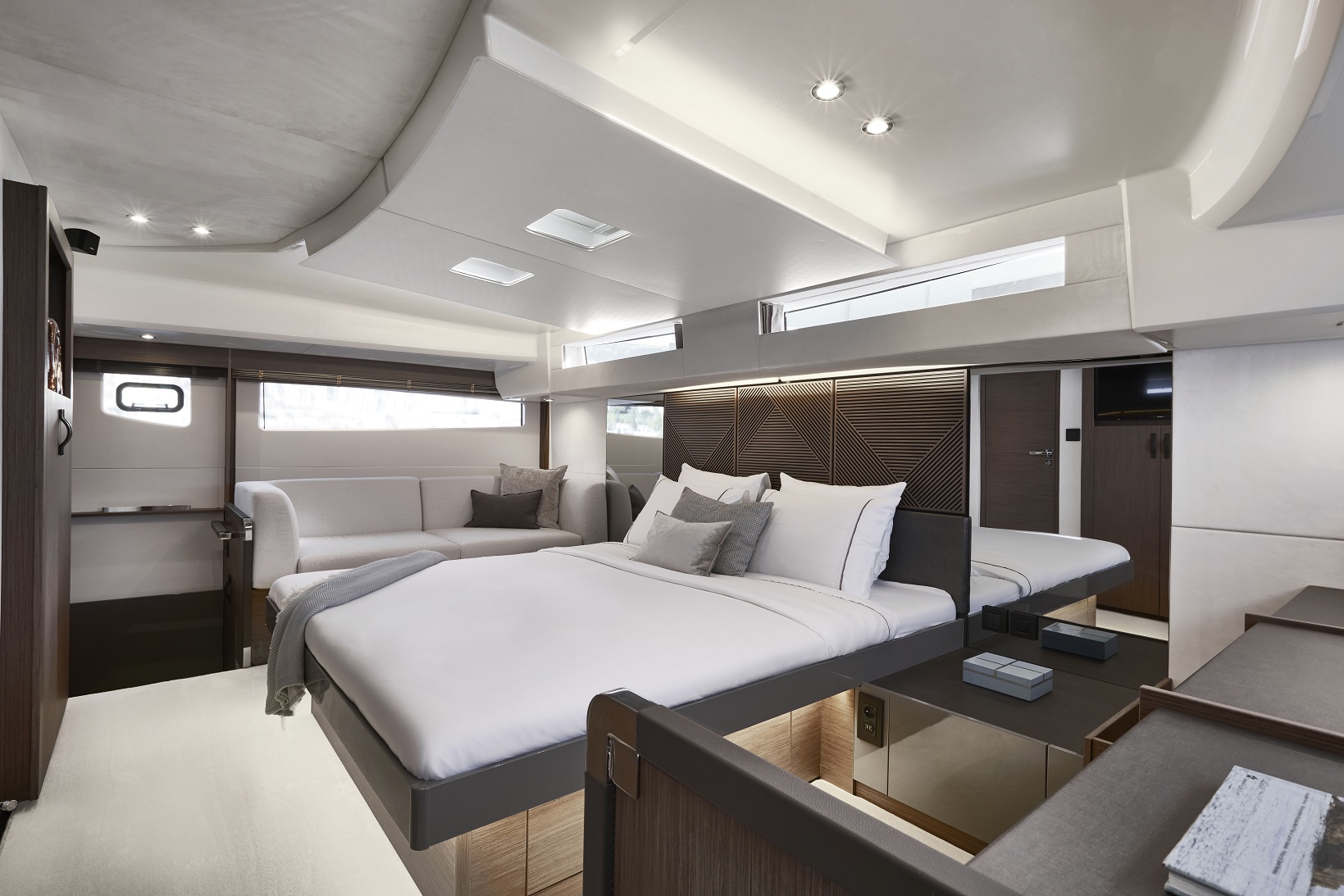 La gran diferencia, y el argumento principal a la hora de inclinarse por este barco, es la cabina de proa del propietario a toda la manga: un espacio real en el sentido literal del término, que incluye una cama central, un largo sofá a babor y un verdadero escritorio de despacho a estribor. Es totalmente independiente del resto del barco y a ella se accede desde el centro de la cabina. El aseo se sitúa a estribor y la ducha a babor, separando la cabina del resto del barco, de manera que la privacidad es absoluta.  Opcionalmente, esta cabina puede dividirse en dos, cada una con su respectivo baño.