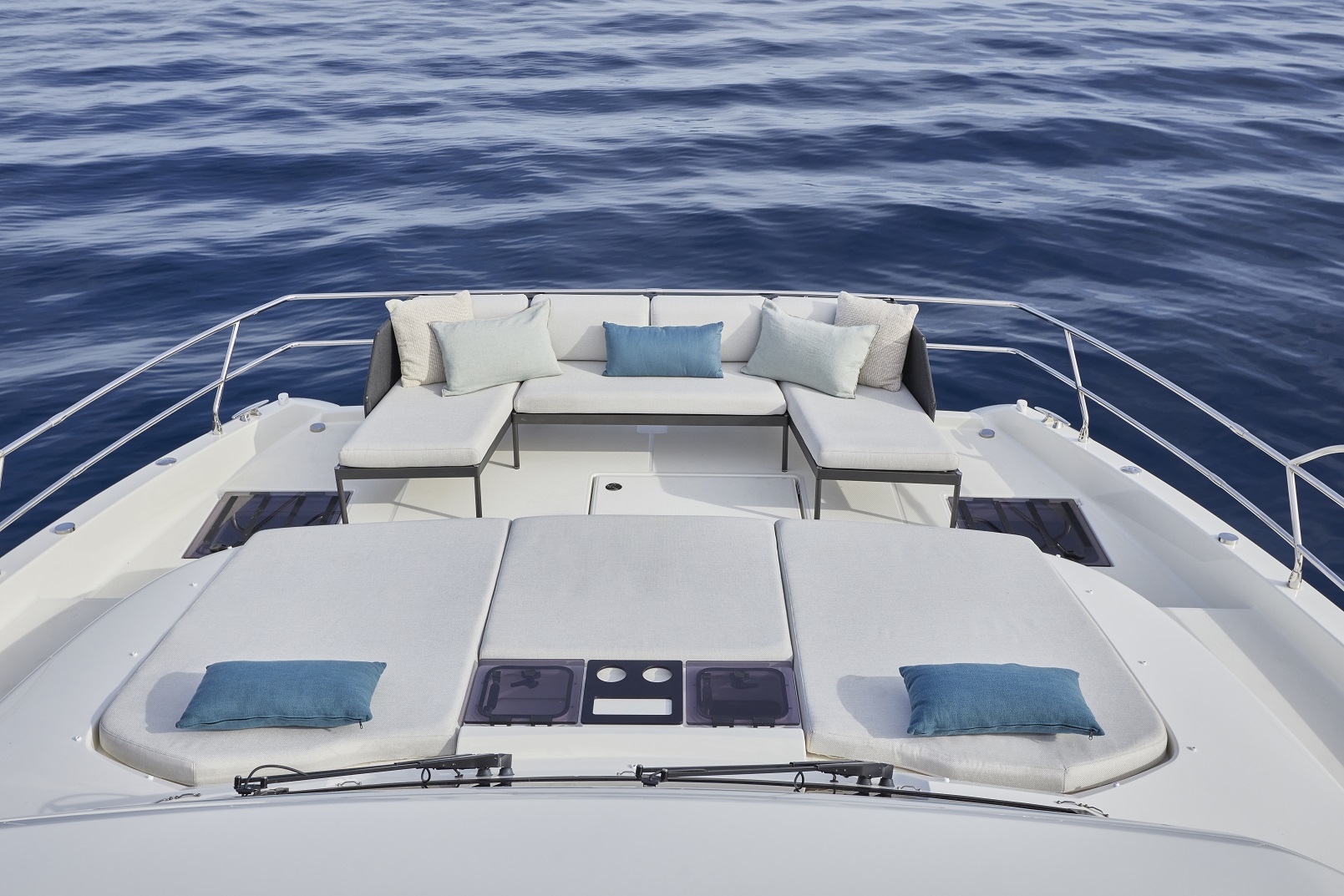 En proa, entre los cascos, los seis metros de manga hacen posible habilitar una gran zona de relax equipada con un gran solárium triple y una banqueta acolchada en U con asientos también a ambos lados de la misma.