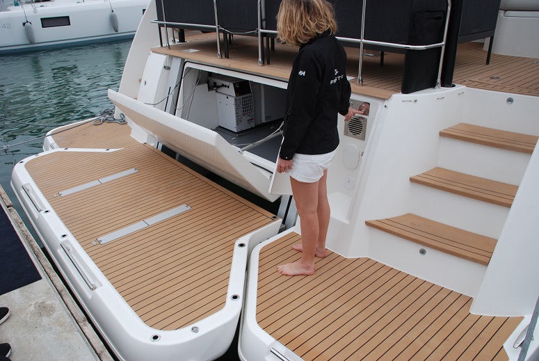 Es también una extensión del espacio de la bañera y al bajarse totalmente permite abrir el portón del garaje de popa. A destacar también los cómodos y amplios accesos tanto desde el pantalán como desde el agua, o la capacidad y funcionalidad de este espacio que es una verdadera cubierta de popa.