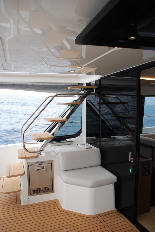Un simple paseo por la cubierta ya nos permite descubrir algunas de sus mejores virtudes, como la plataforma de popa abatible eléctrica que desciende hasta el nivel del mar y con acceso desde la propia bañera cuando está levantada, gracias al paso entre los sofás.