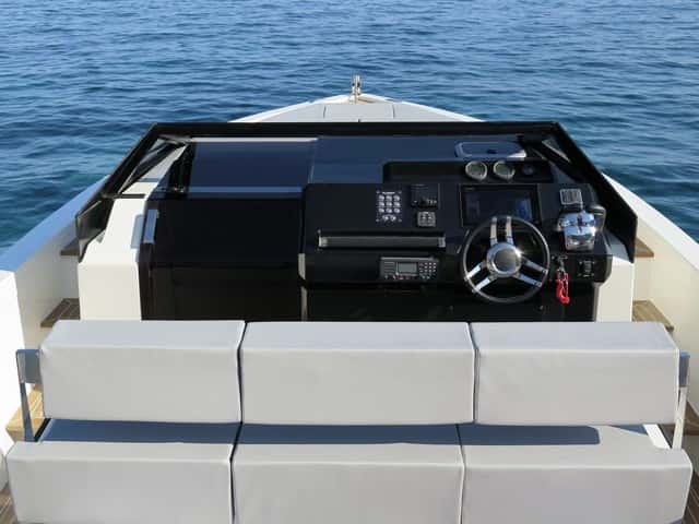 Otro punto en el que hay que hacer hincapié es en el parabrisas, demasiado bajo, por lo que no evita el aire al piloto y acompañante. No faltan los reposapiés y el estilo del volante realza el conjunto. El T top, que protege el puesto de gobierno y parte del solárium, está realizado en fibra de carbono para reducir peso, pero es opcional, a nuestro juicio indispensable en este barco. Un puesto adecuado al programa de este modelo.