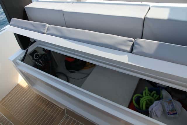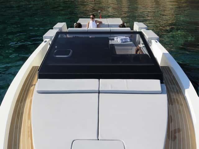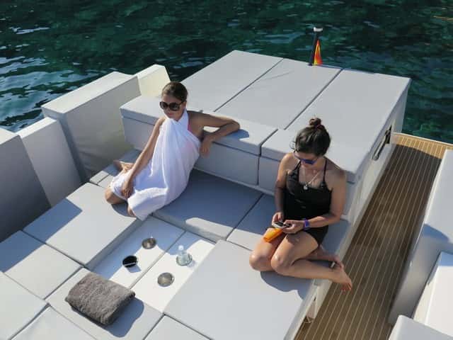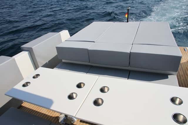 La estética personal de esta eslora, sus dimensiones (especialmente la manga), la distribución de espacios y los distintos elementos que figuran en la bañera, determinan un barco confortable, polivalente, con la versatilidad que proporciona la dinete, convertible en un segundo solárium, o en una chaise longue en torno a una de las dos mesas ajustables. Las posibilidades son numerosas, y los espacios para tomar el sol a bordo se multiplican con las colchonetas de la cubierta de proa, las de popa, y la zona central de la dinete cuando se transforma.